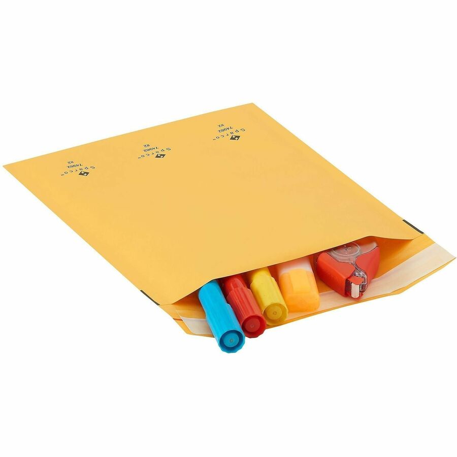 | Marketing Information | Cushioned mailers are made of durable, Kraft material to keep your contained items protected during transit. Lightweight design helps keep your shipping costs to a minimum. Self-seal closure seals your package quickly without requiring water or glue. Interior bubble cushioning ensures your items arrive without any damage. |