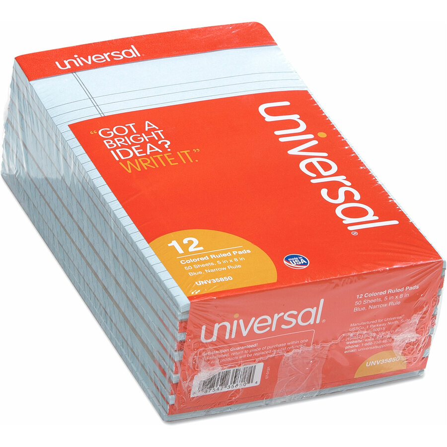Universal Colored Perforated Ruled Writing Pads, Narrow Rule, 50 Blue 5 x 8 Sheets, Dozen